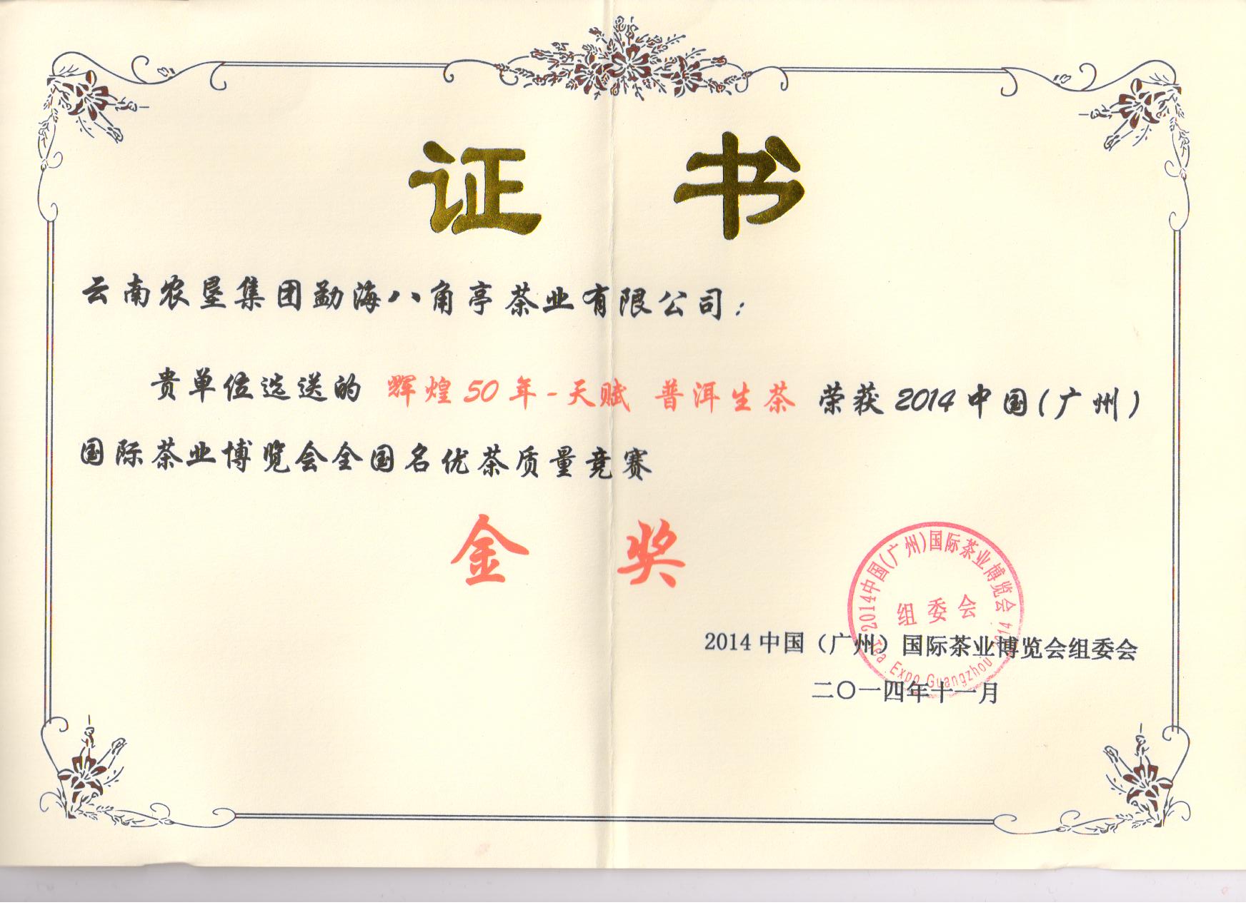 榮譽(yù)資質(zhì) 2014年廣州茶博會金獎